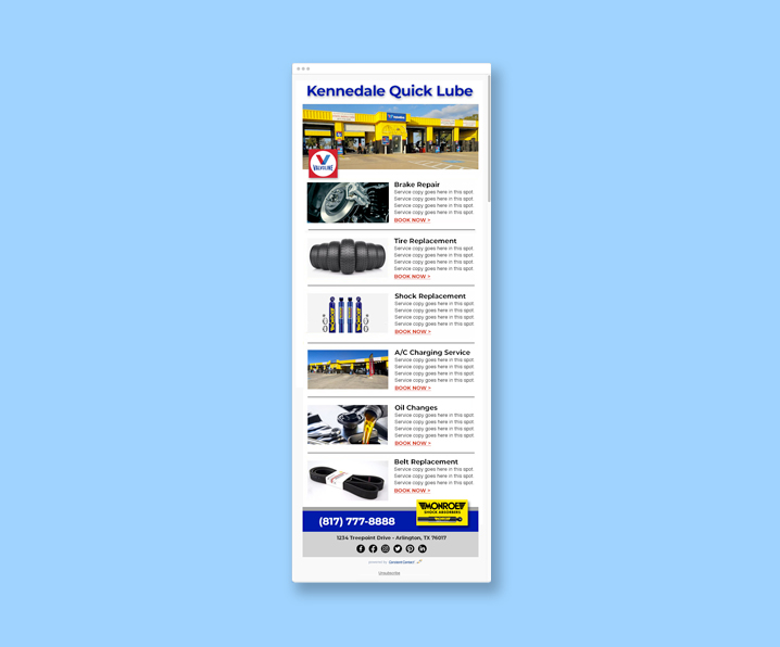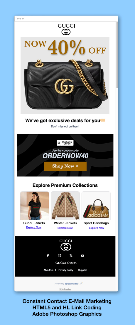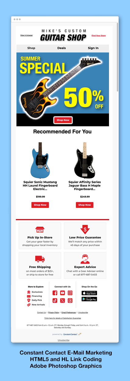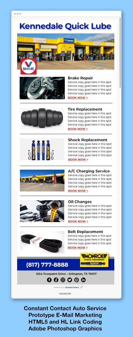 Using Adobe Creative Cloud, direct e-mail marketing can be made for your business. Using Constant Contact, HubSpot or Salesforce CRM, e-mail offers can be made specifically for your customers with discount promotions that work.