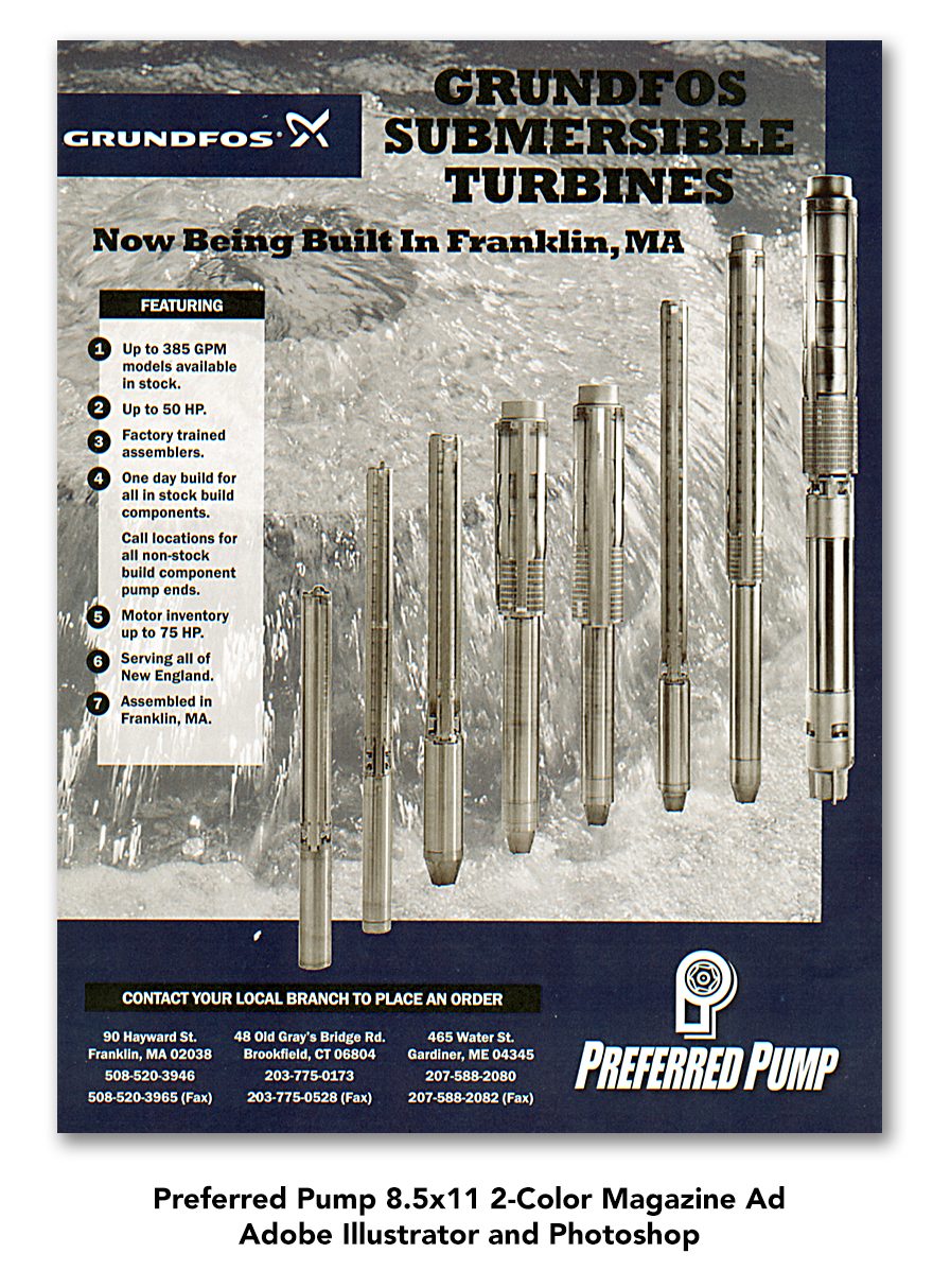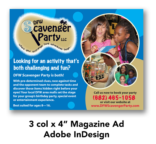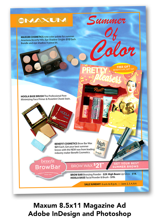 Created with Adobe Creative Suite InDesign, Photoshop and Illustrator. Ads are both 2-Color and 4-Color and in various sizes for both local and national retail clients. Click on each sample for an larger graphic image for visual detail.